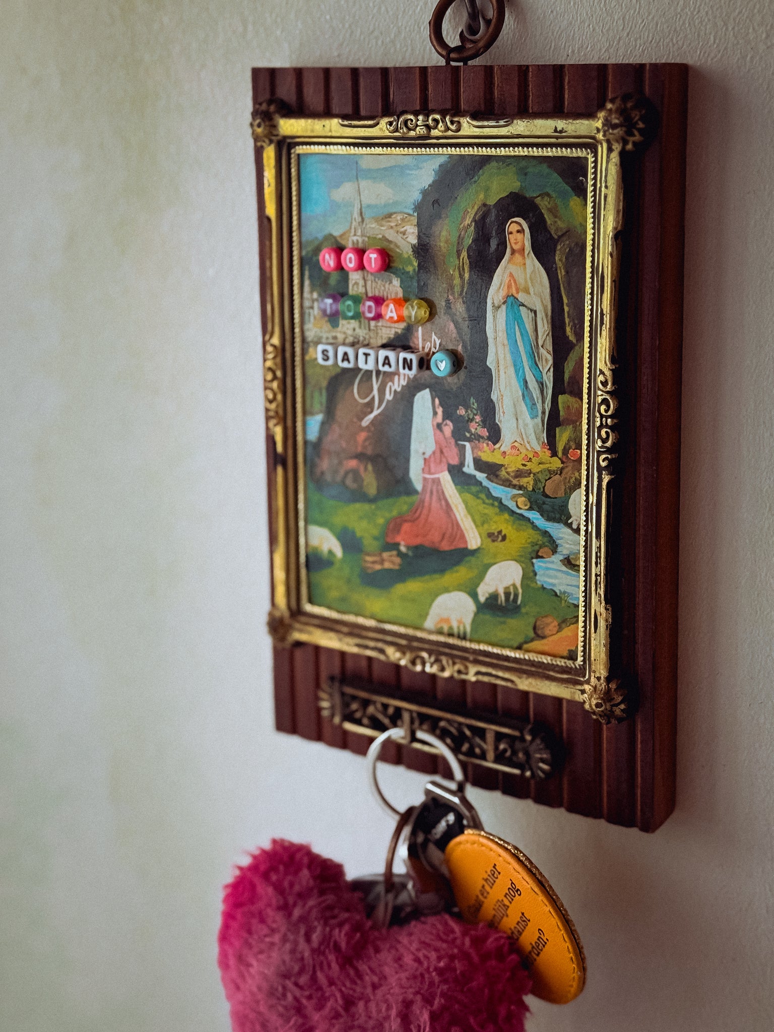 Vintage Lourdes meets modern mantra. Not today, Satan. Bonus: three tiny hooks for keys or trinkets.
